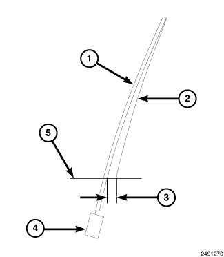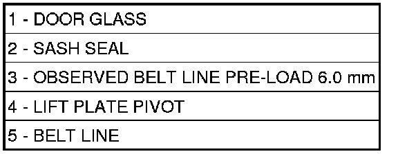 6. Open the door and then carefully close the door until the B-pillar top of glass (1) just touches the quarter glass sash seal (2) and check the B-pillar glass to sash seal gap near the belt line (3). This gap (3) should be adjusted to 6 mm (0.24 in.) to put a cross car pre-load on the door glass. To adjust the gap open the door and push the top edge of the glass inboard or outboard as needed. Close the door and re-check the gap as needed. Check that the door glass to quarter glass is flush to +3 mm (0.11 in.) overflush.