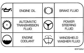 Chrysler uses international symbols to identify engine compartment lubricant and fluid inspection and fill locations.