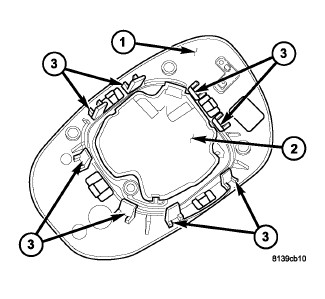 2. Position the mirror glass holder (1) to the mirror assembly and align the eight mirror glass retaining clips (3) to the mirror motor (2).