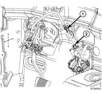 1. Disconnect the adjuster cable (1) running between the accelerator pedal module and the brake pedal assembly at the adjuster motor (2).