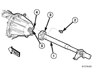 38. Align and connect the propeller shaft flange (3) to the transmission output shaft flange (4) and install the retaining bolts (2) Propeller Shaft - Installation.
