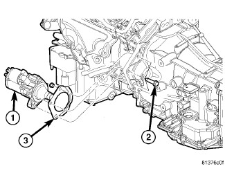 32. Install starter motor (1), closeout (3) and retaining bolts (3). Tighten bolts securely Starter - Installation.