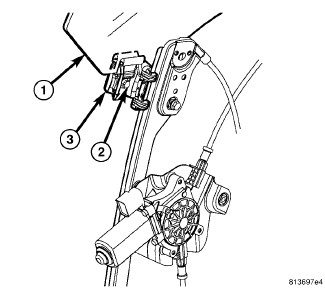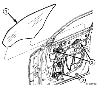 3. Using the regulator, lower the window as required for access to the two window regulator glass clamp screws (2).