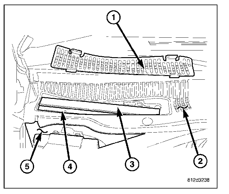 1. Remove the air inlet grille (1) from the wiper module screen (2) located near the dash panel in the engine compartment.