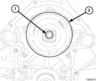 2. Position the phaser (2) in place and install phaser retaining bolt (1) and tighten to 122 Nm (90 ft. lbs.).