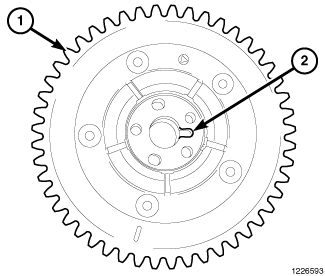 1. Align the slot (2) in the phaser (1) with the dowel on the camshaft.