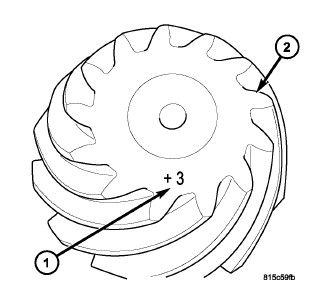 Identifying numbers for the ring gear and pinion are marked on the pinion (1). A plus (+) number, minus (-) number or zero (0). The pinion depth variance/deviation (1) is the amount the depth varies from the standard depth setting of a pinion marked with a (0). The standard depth provides the best gear tooth contact pattern.