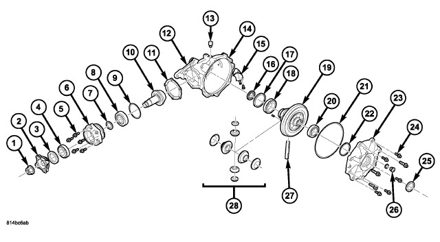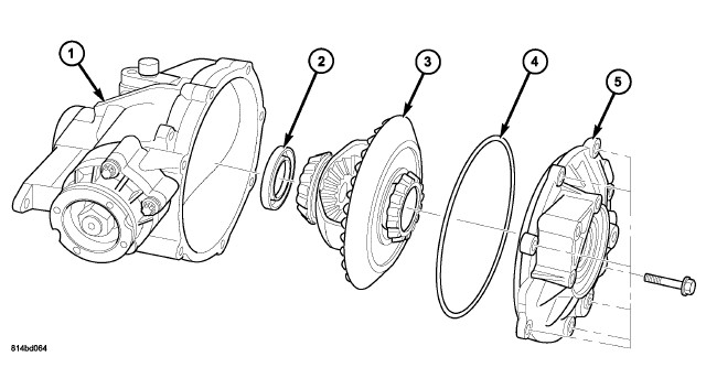 6. Install differential/ring gear assembly (3), new cover o-ring seal (4), and cover (5).