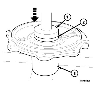 1. Using Handle C-4171 (2) and Installer D-129 (1), press new pinion head bearing cup (3) into pinion gear housing.