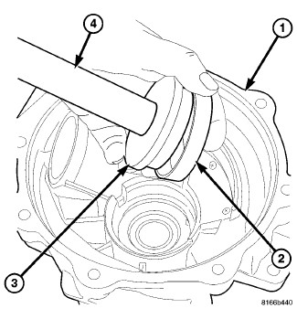 4. Using Installer 9666 (1), install new differential side bearing (ring gear side).