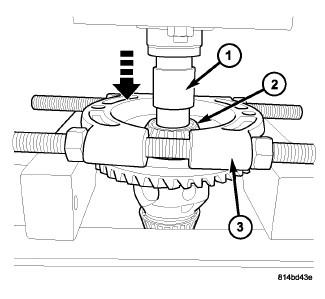 5. Using Plug 9676 (1) and Bearing Splitter 1130 (3), press differential side bearing (2) off of ring gear side and discard.