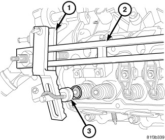 8. Using valve spring compressor MD998772A (1,2) and valve spring adapter 6885 (3), compress valve spring and remove valve keepers.