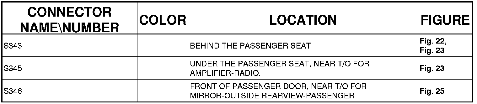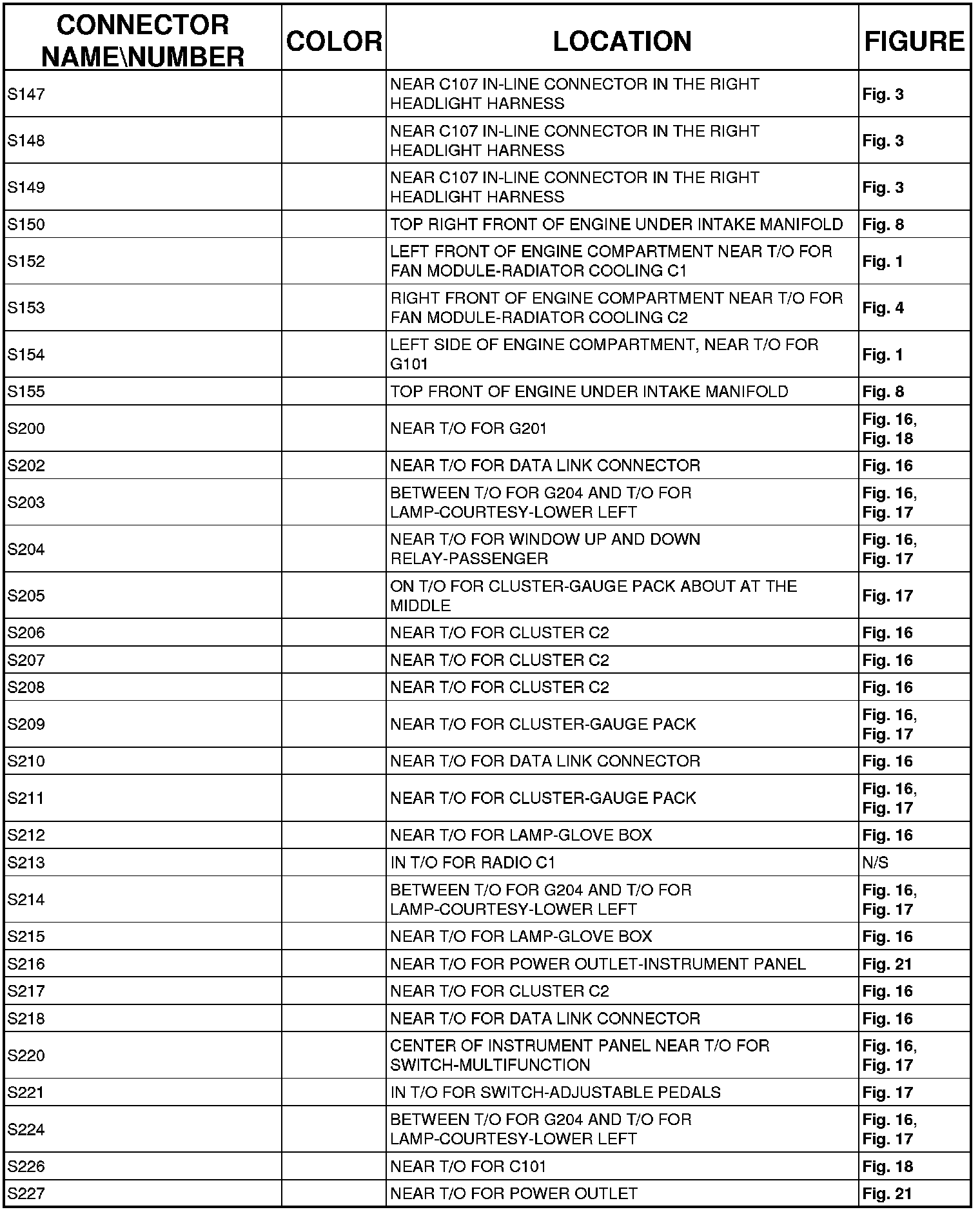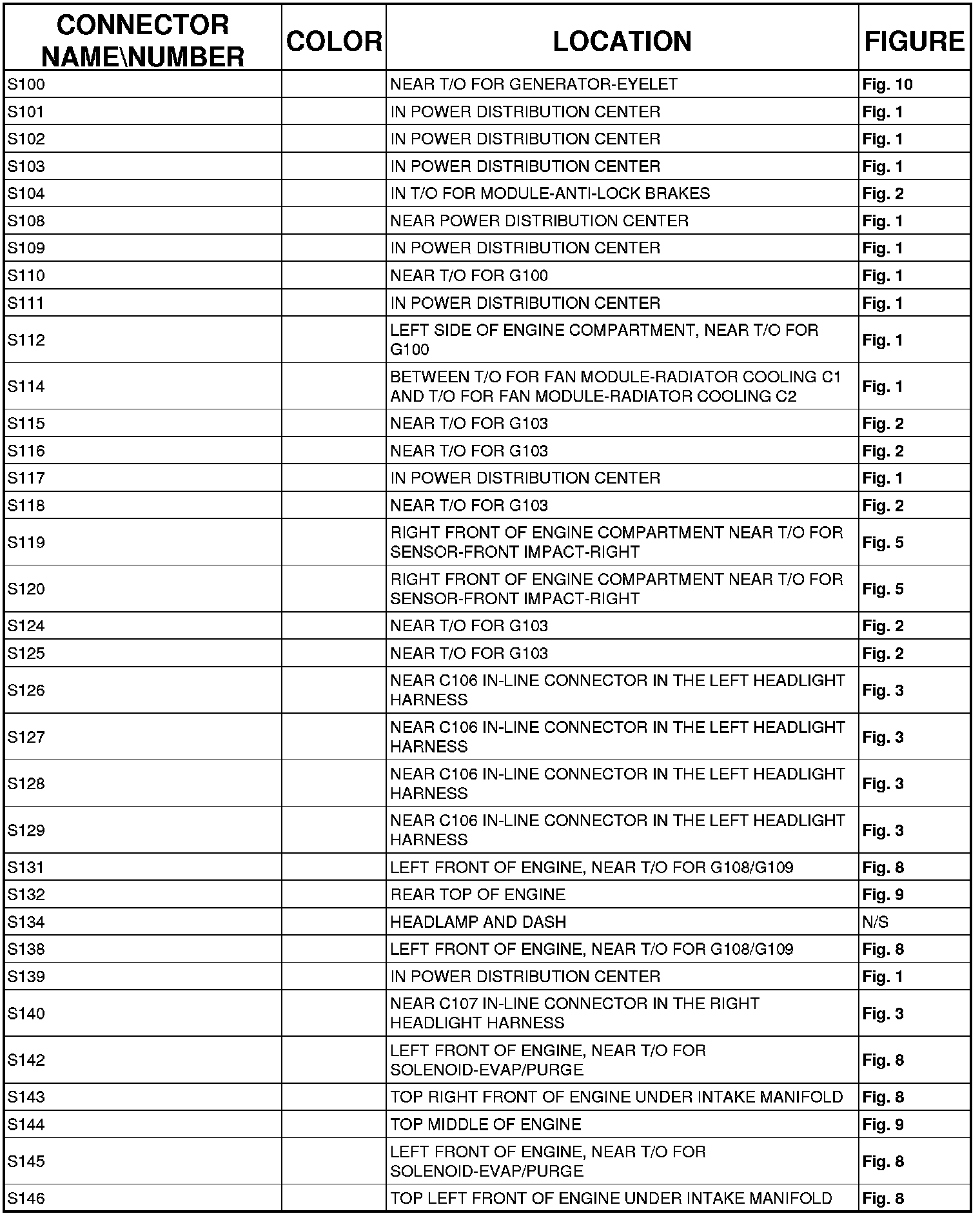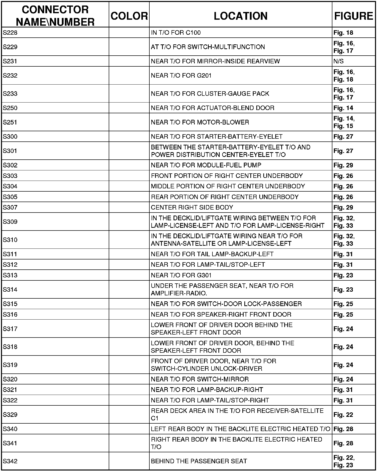The abbreviation T/O (Take Out) is used in the location column to indicate a point in which the wiring harness branches out to a component.