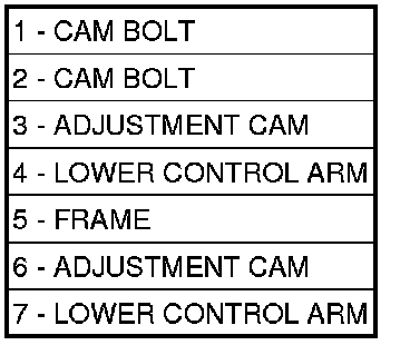 Camber angle adjustment involves the repositioning of the lower control arm (4, 7) pivot bolts using the adjustment cams. There are two cams located on each lower control arm pivot bolt (1, 2), four per each corner of the vehicle front and rear. Repositioning of the pivot bolt cams in the same direction moves the lower ball joint in or out to obtain the required camber specifications.