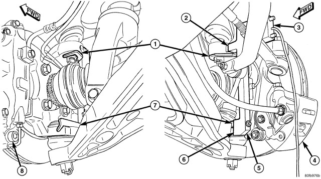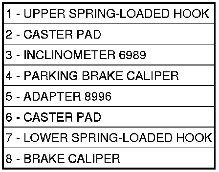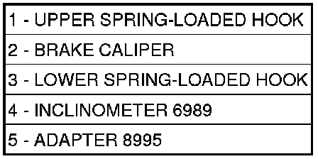 Both front and rear caster angle on this vehicle can be read. Rather than using the alignment equipment's traditional sweep method, caster angles are read directly off the front and rear knuckles through inclinometer sensors, bracket mounted to the knuckles. These inclinometers are wired to the scan tool. Use Inclinometers (2), Special Tools 6989, Switch Box (1), Special Tool 6996, Front Caster Adapters, Special Tool 8995, and Rear Caster Adapters, Special Tools 8996, attached to a scan tool equipped with a PEP module capable of reading inclinometers.