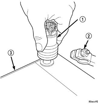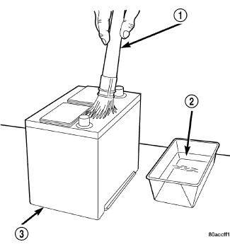 3. If the removed battery is to be reinstalled, clean the outside of the battery case (3) and the top cover with a sodium bicarbonate (baking soda) and warm water cleaning solution (2) using a stiff bristle parts cleaning brush (1) to remove any acid film. Rinse the battery with clean water. Ensure that the cleaning solution does not enter the battery cells through the vent holes. If the battery is being replaced, Battery for the factory-installed battery specifications. Confirm that the replacement battery is the correct size and has the correct ratings for the vehicle.