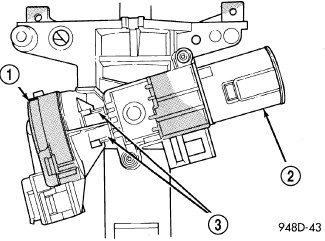 2. Place key cylinder in RUN position. Through the hole in the lower shroud, depress lock cylinder retaining tab and remove key cylinder.