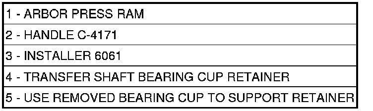 32. Install transfer shaft bearing cup into retainer (4) using Installer 6061 (3).