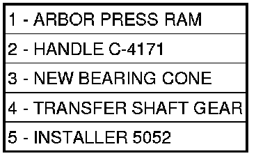 34. Install transfer gear bearing cone to transfer gear (4) using Installer 5052, (5) Handle C-4171 and an Arbor Press.