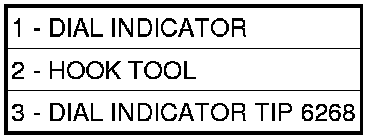 54. Set up Dial Indicator (1), Indicator tip 6268 (3) and Hook tool (2), measure 2/4 clutch clearance. Press down on clutch pack with finger and zero dial indicator. 2/4 clutch pack clearance is 0.76-2.64 mm (0.030-0.104 in.). Set up indicator and record measurement in four places. Take average of readings. If clearance is outside this range, the clutch is assembled improperly. There is no adjustment for 2/4 clutch clearance.