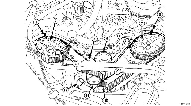 Remove the outer timing covers. Rotate the crankshaft until the pointer on the crankshaft sprocket (10) aligns the TDC mark on the oil pump (9). Check to determine if the camshaft sprocket (2, 7) timing marks (1, 8) are aligned with the marks on the inner timing cover. It may take an additional full revolution of the crankshaft before the camshaft sprocket marks are aligned.
