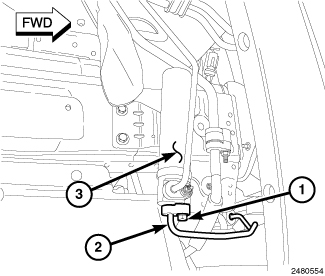 9. Position the heat shield (3) onto the studs (2) located on the dash panel in the engine compartment.