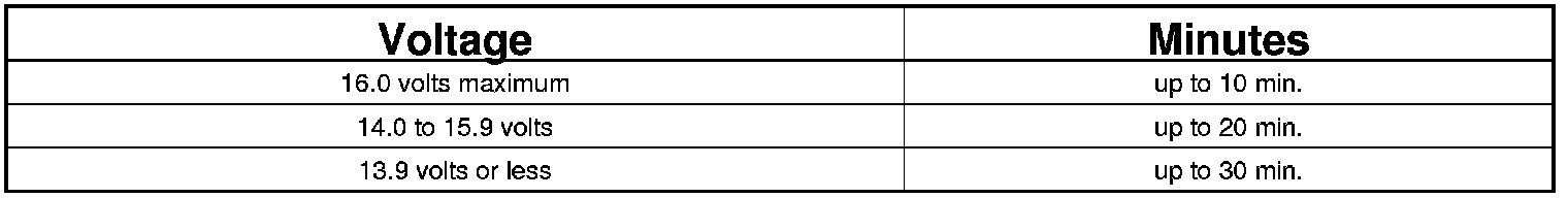 3. Battery chargers vary in the amount of voltage and current they provide. The amount of time required for a battery to accept measurable charging current at various voltages is shown in the Charge Rate Table. If the charging current is still not measurable at the end of the charging time, the battery is faulty and must be replaced. If the charging current is measurable during the charging time, the battery may be good and the charging should be completed in the normal manner.