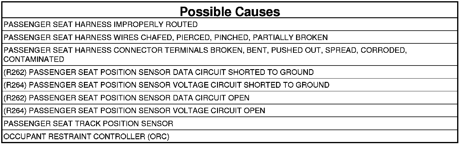 5. CHECK (R262) PASSENGER SEAT POSITION SENSOR DATA CIRCUIT AND (R264) PASSENGER SEAT POSITION SENSOR VOLTAGE CIRCUIT FOR A SHORT TO GROUND