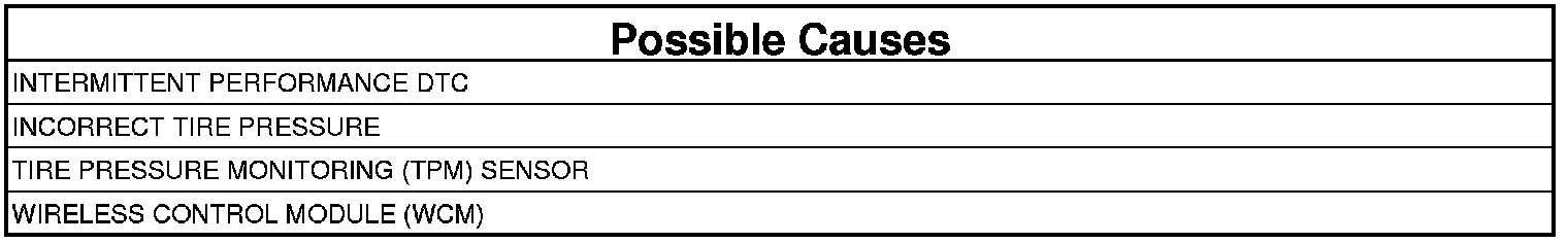 NOTE: The DTC can be caused by many different factors and might not be a sensor/transmitter or a WCM) fault. Interference from other elements will over power the sensor/transmitter RF frequency making erratic operation to the TPM system. Check the vehicle for aftermarket accessories that could compromise the RF frequency signal before diagnosing the TPM system.