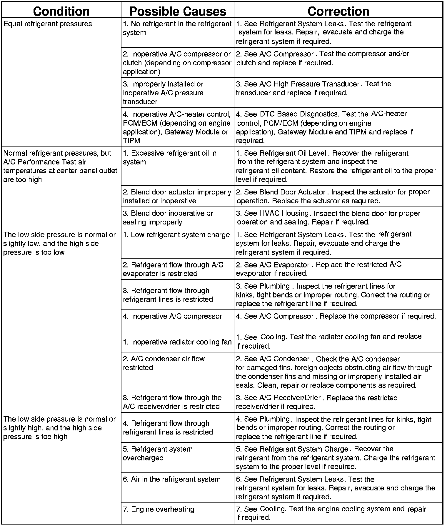 5. Compare the air temperature at the center panel outlet and the A/C system pressures to the A/C Performance Temperature and Pressure chart.