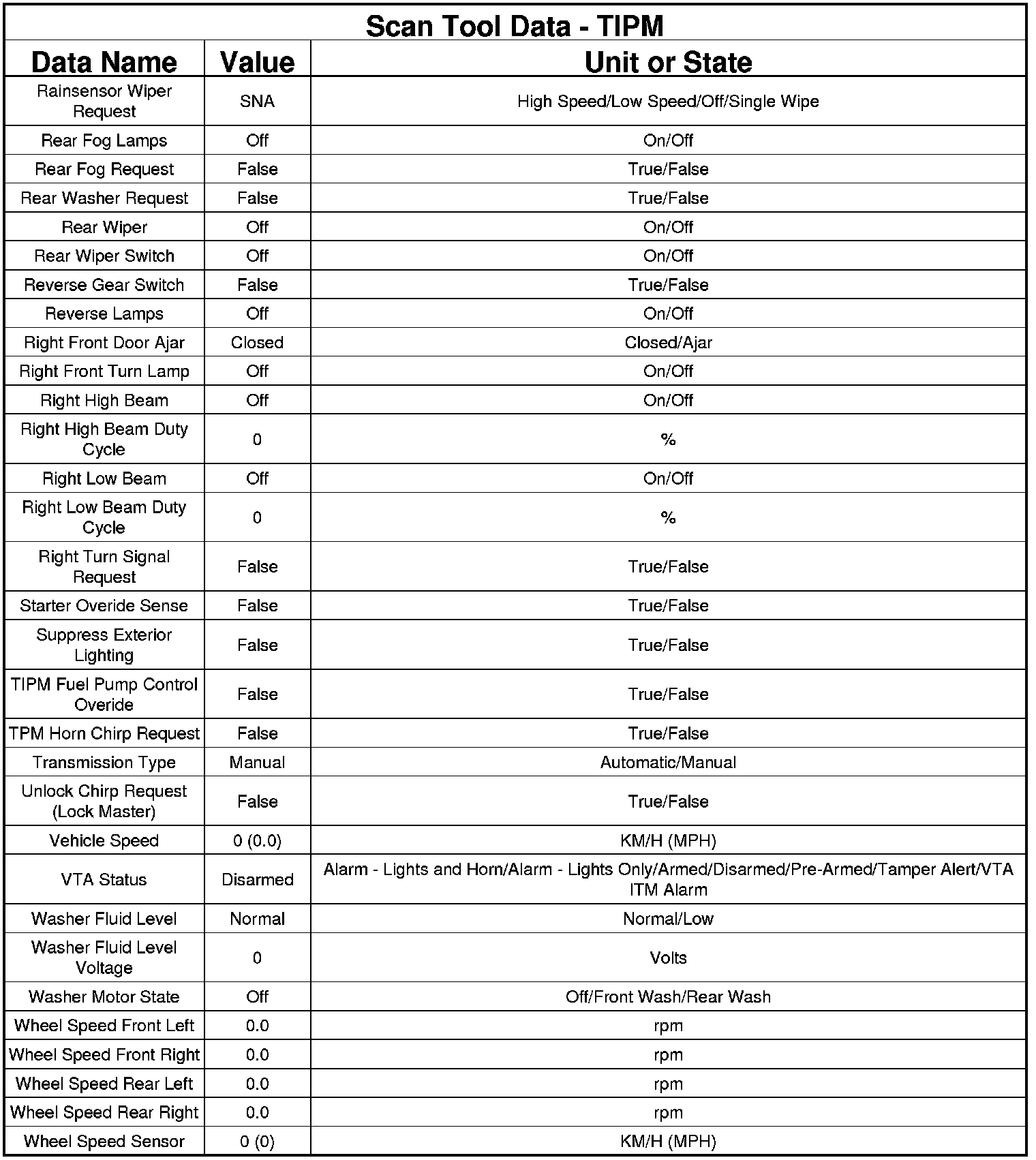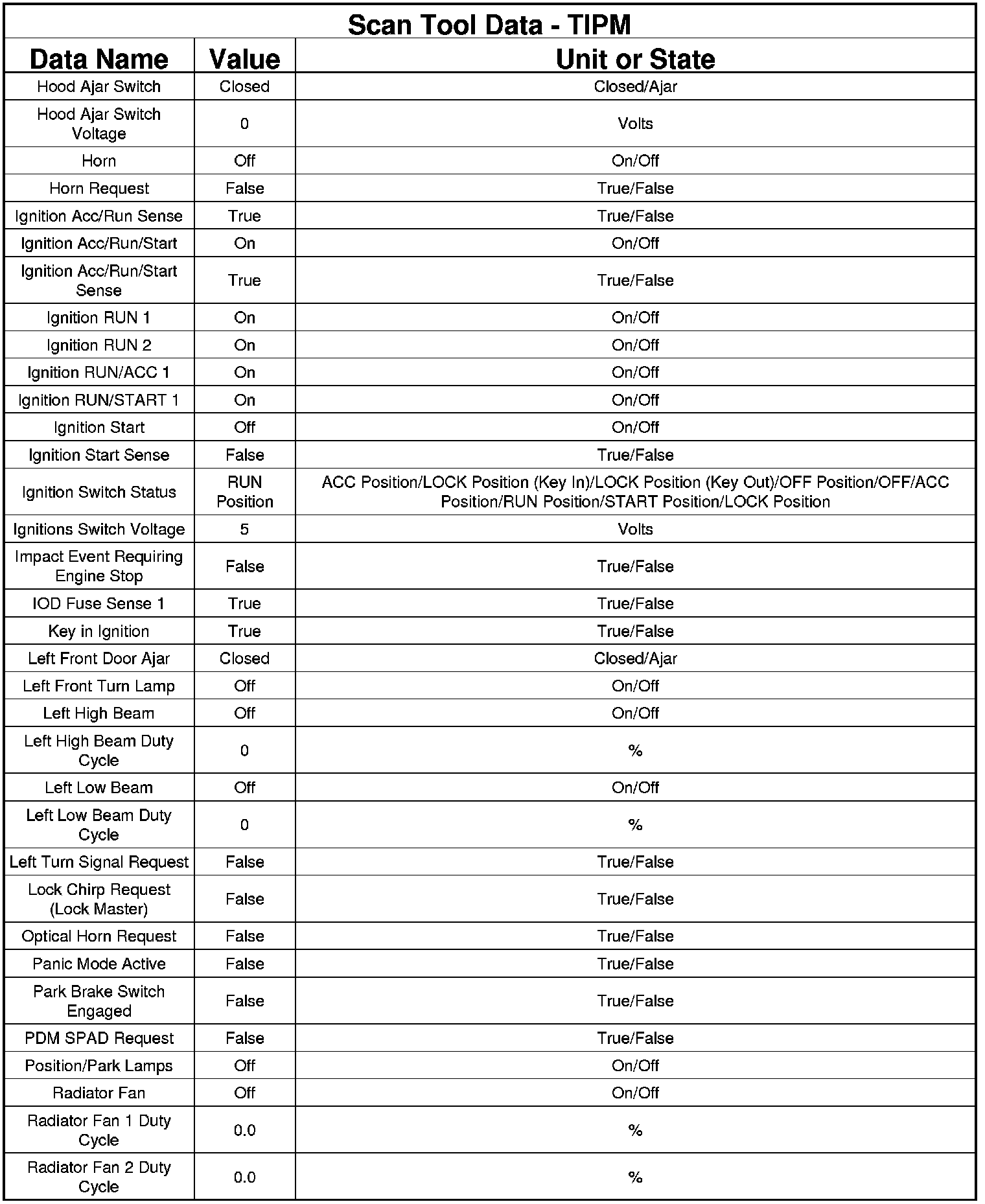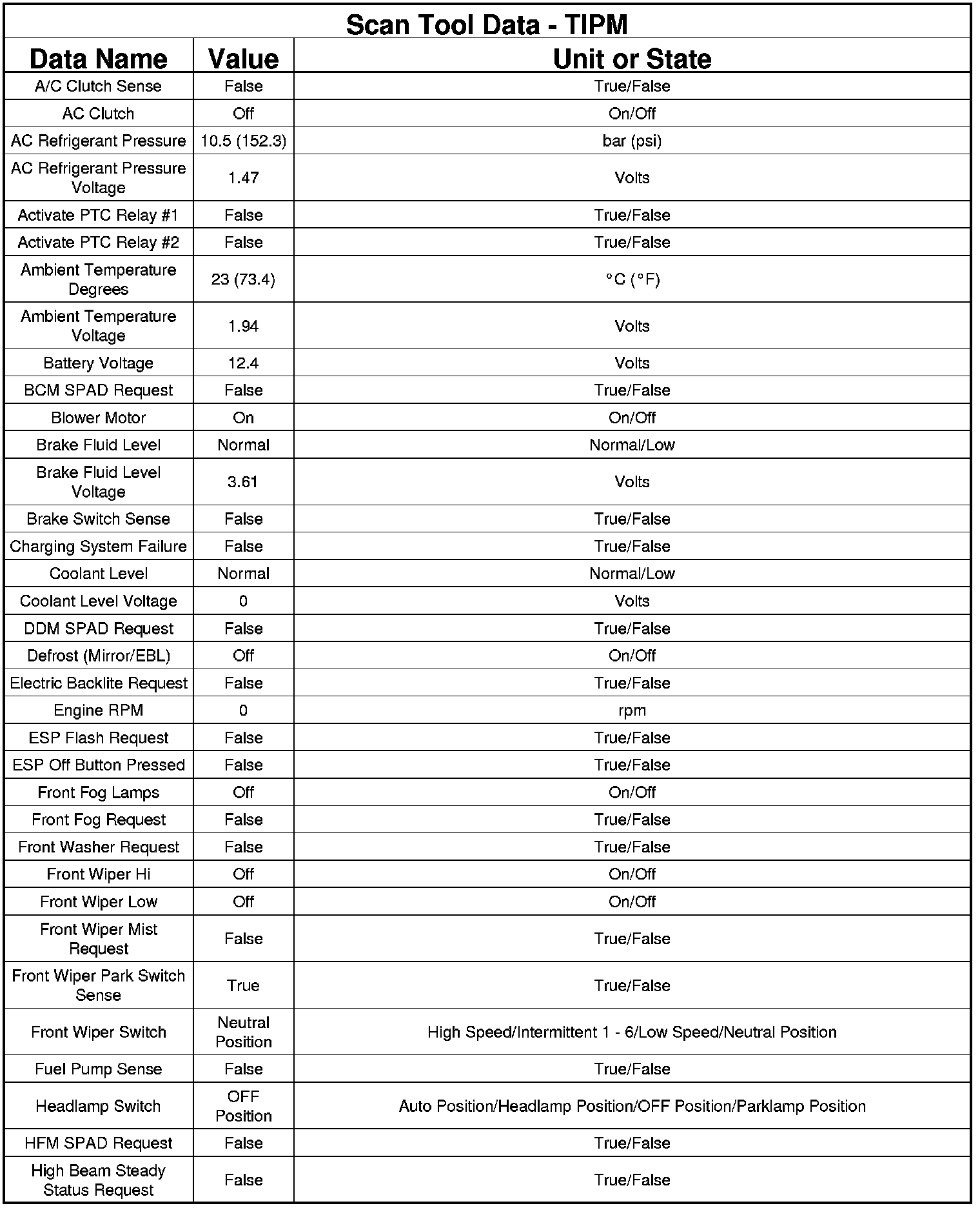 The following chart lists data values taken from the Scan Tool Totally Integrated Power Module (TIPM) data list. The data is to be used for reference only.