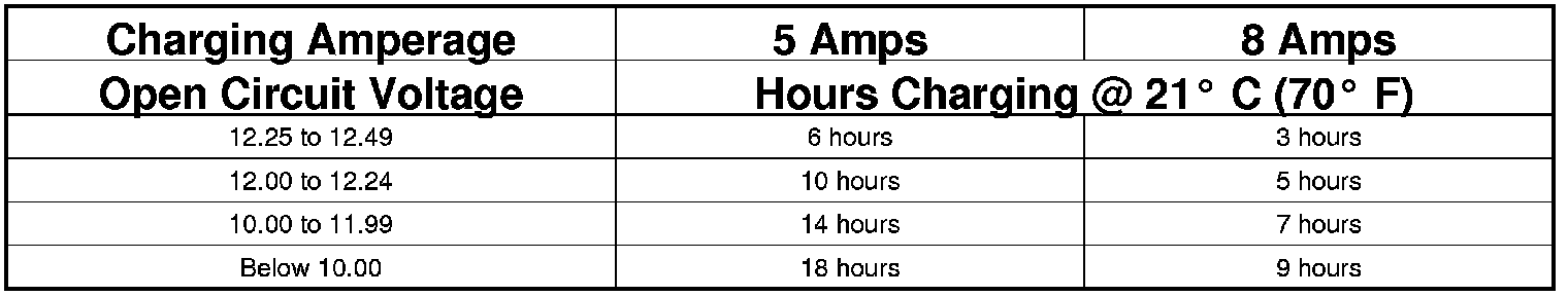 The Battery Charging Time Table gives an indication of the time required to charge a typical battery at room temperature based upon the battery state-of-charge and the charger capacity.