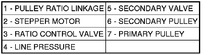The pulley ratio linkage moves to the left direction of the stepper motor. The line pressure circuit opens due to the movement of the ratio control valve which links to the pulley linkage, and line pressure is applied to the primary pulley.