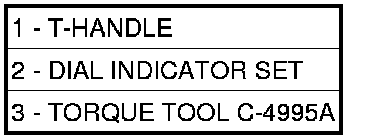 6. Apply a medium load to differential with Torque Tool C-4995A (3) and a T-handle (1), in the downward direction. Roll differential assembly back and forth a number of times. This will settle the bearings. Zero the dial indicator (2). To obtain end play readings, apply a medium load in an upward direction while rolling differential assembly back and forth. Record end play.