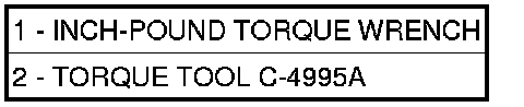 10. Using Torque Tool C-4995A (2) and an inch-pound torque wrenched (1) check turning torque of the differential assembly. The turning torque should be 6 to 12 in. lbs. If the turning torque is too high, install a 0.05 mm (0.002 inch) thinner shim. If the turning torque is too low, install a 0.05mm (0.002 inch) thicker shim.