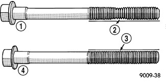 1. Examine connecting rod bolts for stretching (1). Stretching (1) can be checked by holding a scale or straight edge against the threads. If all the threads do not contact the scale the bolt must be replaced.