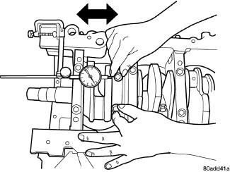 1. Mount a dial indicator to a stationary point on engine. Locate probe perpendicular to and resting against the connecting rod cap being checked. Move connecting rod all the way to rear of its travel. Zero the dial indicator. Move connecting rod forward to limit of travel and read the dial indicator. Compare measurement to specification listed in engine specifications Engine Specifications Repeat procedure for each connecting rod. Turn crankshaft for connecting rod accessibility.