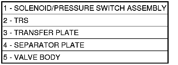 The Transmission Range Sensor (TRS) (2) is mounted to the top of the valve body inside the transmission and can only be serviced by removing the valve body assembly. The electrical connector extends through the transmission case.