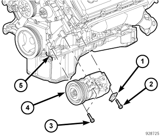 3. Loosely install the two bolts (3) that secure the front of the A/C compressor to the cylinder block (5).