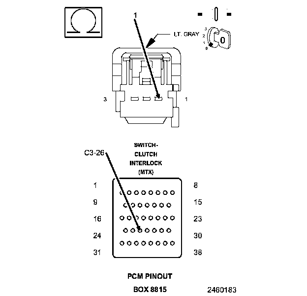 1. Using the wiring diagram/schematic as a guide, inspect the wiring and connectors between the Clutch Interlock Switch and the Powertrain Control Module (PCM).