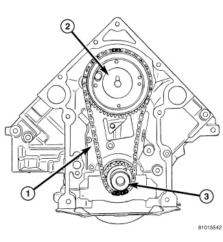 CAUTION: The timing chain must be installed with the single plated link aligned with the dot and or paint marking on the camshaft sprocket. The crankshaft sprocket is aligned with the dot and or paint marking on the sprocket between two plated timing chain links.