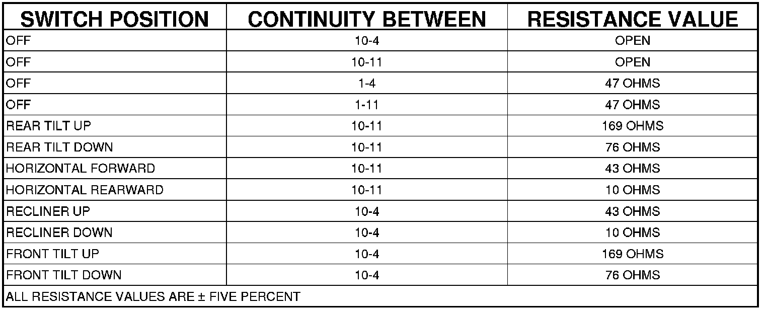 3. Use an ohmmeter to test the continuity of the power seat switch. Refer to PASSENGER POWER SEAT SWITCH CONTINUITY table. If not OK, replace the inoperative power seat switch. If switch tests OK . Component Tests and General Diagnostics