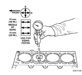Measure the cylinder bore at three levels in directions A and B. Top measurement should be 10 mm (3/8 in.) down and bottom measurement should be 10 mm (3/8 in.) up from bottom of bore. . Engine Specifications