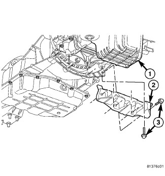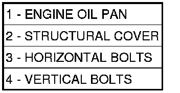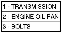 26. Remove the bolts (1) holding the engine oil pan (2) to the transmission (3).