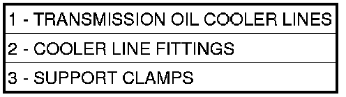 20. Disconnect transmission fluid cooler lines (1) at transmission fittings (2) and clips (3).
