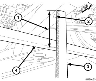 8. Measure and record vehicle's front design height. Measure distance (1) straight up from bottom of straightedge (4) to each frame rail at the nearest point to the Principle Locating Point (PLP) hole (2).
