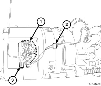 2. Push down on the tab (3) and slide fuel level sensor (1) down and off of the channel on the housing of the pump module.