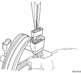 6. Using a small screwdriver lift locking finger (1) away from terminal (2) and push terminal out of connector. Remove the fuel level sensor signal and ground terminals out of the connector.