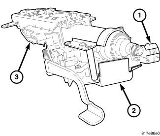 A special steering column is used in some Export areas meeting Thatcham security requirements. This steering column (3) is much the same as the standard steering column except for the addition of a tamper-proof shield (2) around the lock cylinder housing and an antitheft cup (1) surrounding the key cylinder. The tamper-proof shield disallows service of the lock cylinder housing. The antitheft cup can be removed allowing access to the key cylinder for service purposes.