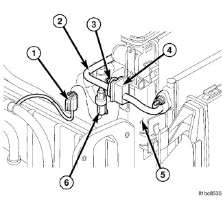 1. If removed, install the A/C pressure transducer (6) onto the A/C discharge line (2). Tighten the A/C pressure transducer securely.